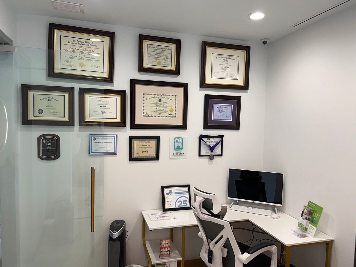 Dr. Hart, our holistic dentist, had her patients in mind when she designed the interior space of her new biological dental office that features glass, oval shapes, waves and corresponding light fixture. This unique interior design reflects harmony, calmness, wellness, lightness, airy, transparent and clean aesthetics of the practice and, by extension, Dr. Hart’s philosophy of holistic dental care that she strives to offer her patients.